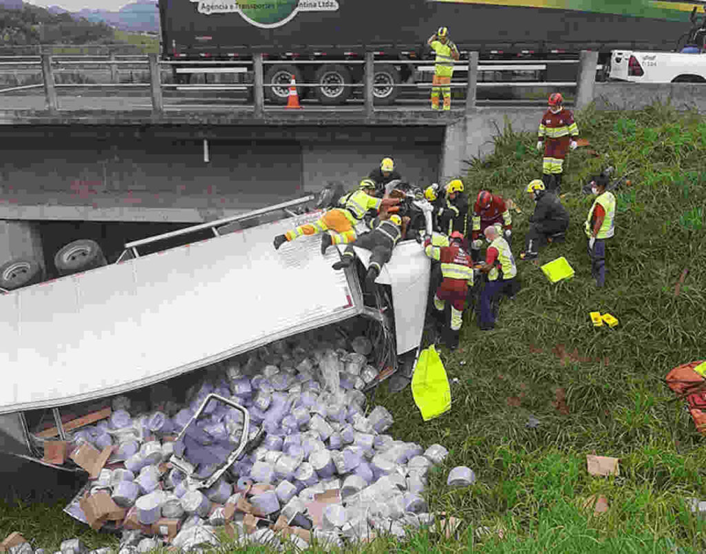 Tubarão: caminhão cai de ponte na BR-101 e condutor fica preso às ferragens
