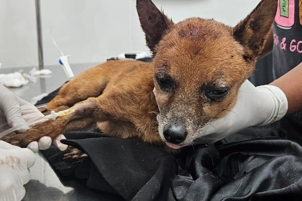 O animal foi encontrado por uma protetora de animais local, que mostrou a situação através de suas redes sociais. Ela resgatou o cachorro e encaminhou à clínica veterinária.