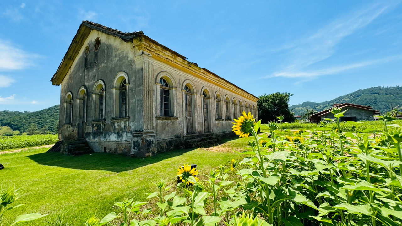 São milhares de flores amarelas que passam o dia olhando para o sol e crescem a cada dia, transformando a paisagem e emoldurando a centenária casa construída no período da imigração italiana.