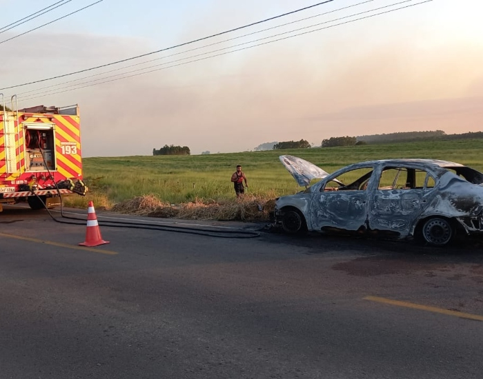 Um veículo foi totalmente destruído por um incêndio no início da noite dessa quinta-feira (28), no Balneário Esplanada, em Jaguaruna. O motorista conduzia seu carro, quando percebeu fumaça saindo do painel.