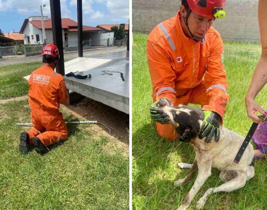 Cachorro é resgatado após ficar trancado embaixo de rampa em Jaguaruna