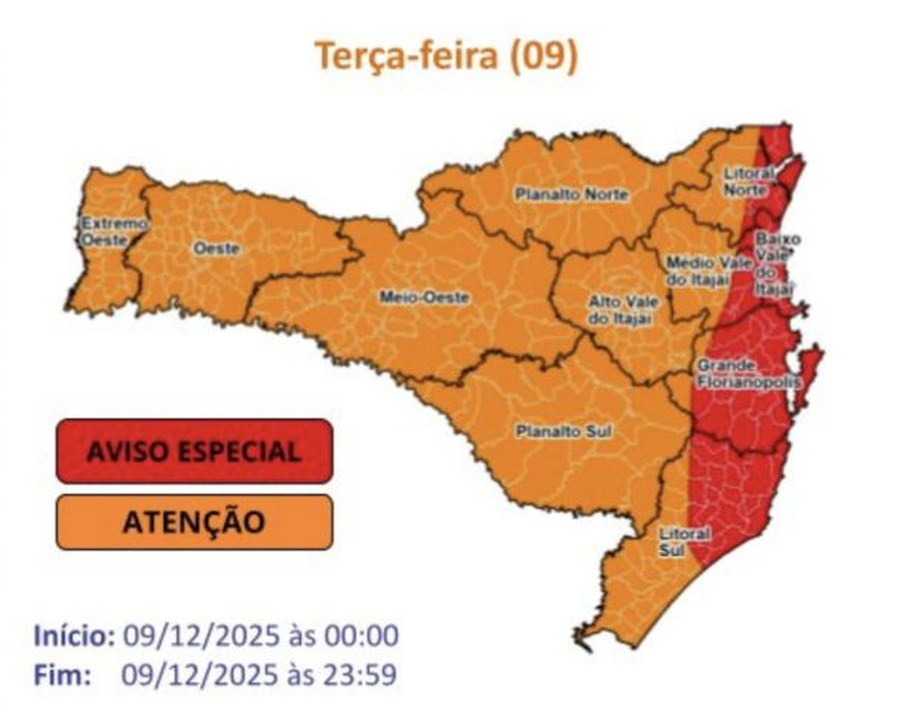 Com o avanço do ciclone sobre Santa Catarina na terça-feira (9), a chuva ganha força e mantém risco elevado para alagamentos e enxurradas, especialmente em áreas litorâneas e serranas. Nessas regiões, as rajadas de vento podem atingir 70 km/h.