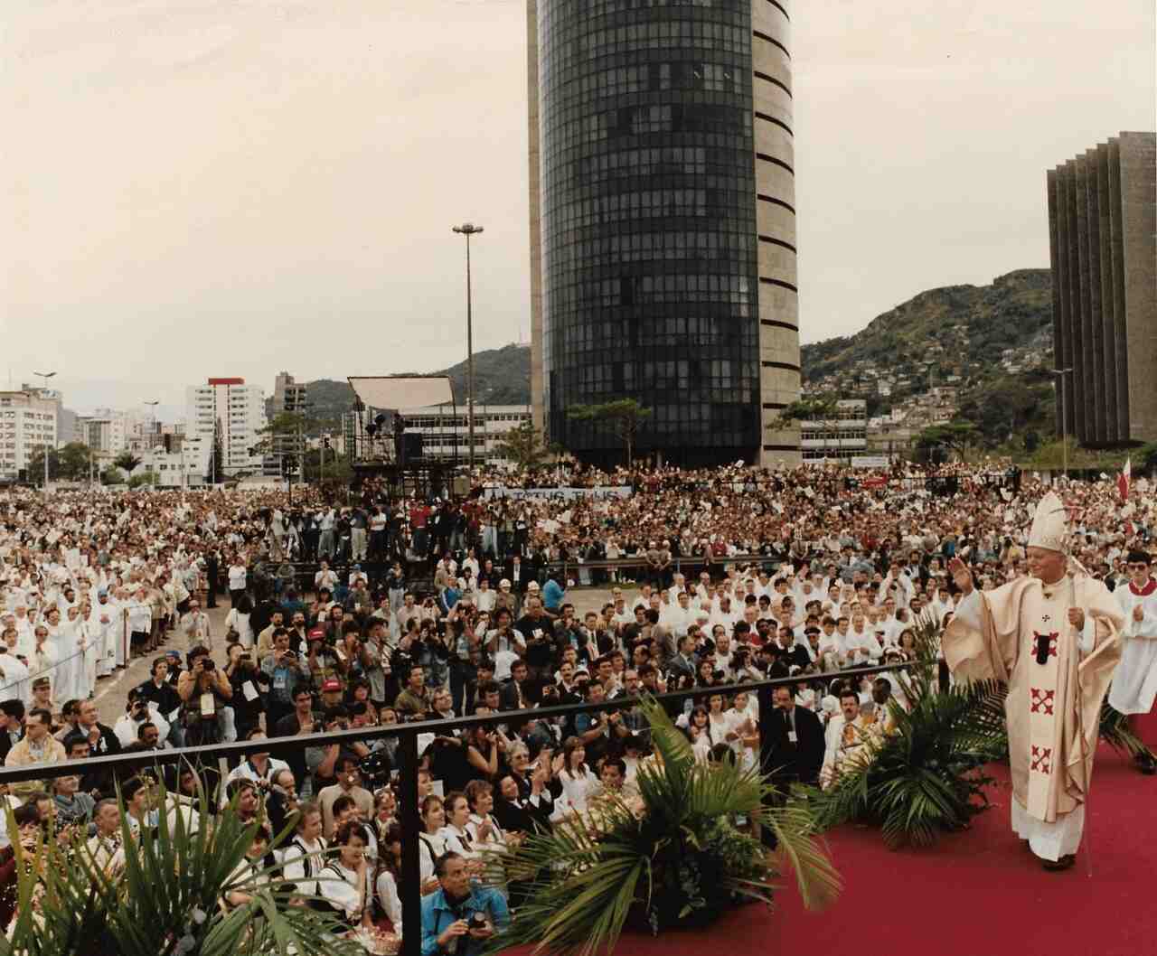 “Fiz a transmissão do evento ao vivo para a Rádio Tubá. Como choveu, coloquei o equipamento debaixo da arquibancada. Minha esposa Maria de Lourdes me acompanhou. Entre os jornalistas e radialistas presentes, uns 300, mais ou menos, houve sorteio para que um representasse todos em encontro reservado com o papa”, diz Arilton.