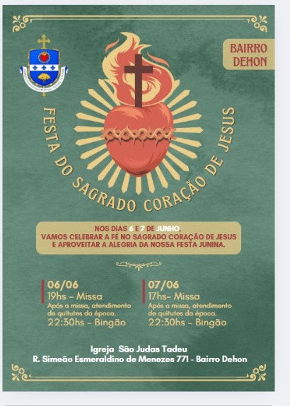 - 07/06: Missa em honra ao Sagrado Coração de Jesus presidida pelo padre Willian Fernandes, às 19 horas;
