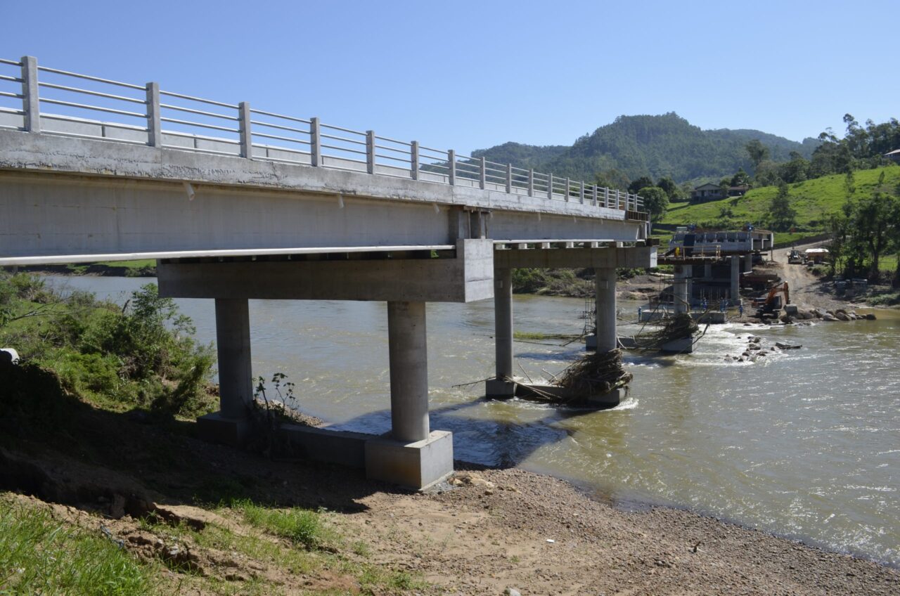 O andamento das obras está bem adiantado. Na parte central, um par de colunas está quase concluído, enquanto o outro par já teve as bases concretadas. Na margem direita, a primeira parte da ponte já tem as vigas longarinas colocadas. Os trabalhadores estão realizando a montagem e fixação de todas as ferragens necessárias para a concretagem do pavimento e outras partes da nova ponte.