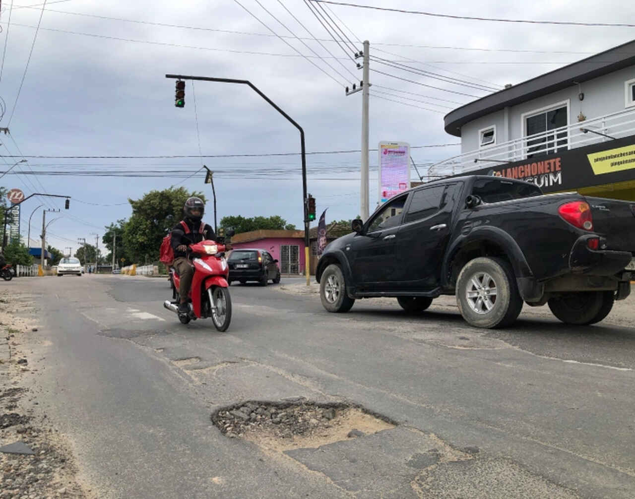 Além dos constantes buracos em toda a extensão da Rua Aldo Hülse, os moradores reclamam dos transtornos no trânsito, no cruzamento com a Rua João Adolfo Corrêa, próximo à lanchonete Pinguim.