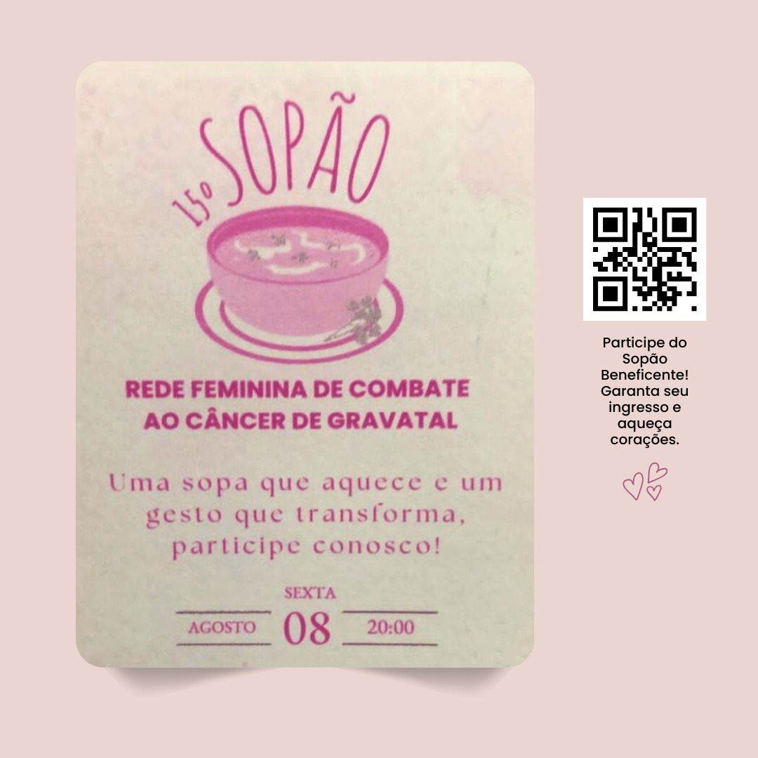 A Rede Feminina de Combate ao Câncer de Gravatal realiza nesta sexta-feira (8), a 15ª edição do Sopão Beneficente, no Salão Paroquial Sagrado Coração de Jesus, no Centro da cidade. O evento tradicional busca reunir a comunidade em um momento de confraternização e solidariedade, com o objetivo de arrecadar fundos para melhorias na sede da instituição.