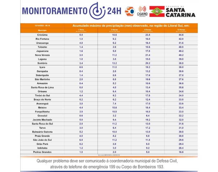 O município também registrou um acumulado de 40,8 milímetros, um pouco a mais que Jaguaruna e Laguna, que registraram 40,2 e 39,8 milímetros, respectivamente.