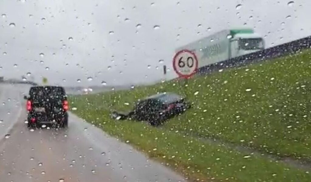 Motorista perde o controle e carro sai da pista na BR-101, em Pescaria Brava