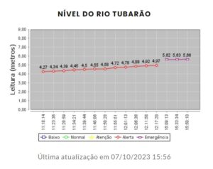 Segundo dados atualizados da Plantar Agronomia, o nível do Rio Tubarão aumentou, indo para 5,66 metros em atualização às 15h50. O estado de urgência se tornou de emergência. Em algumas localidades, o rio já extravasou.